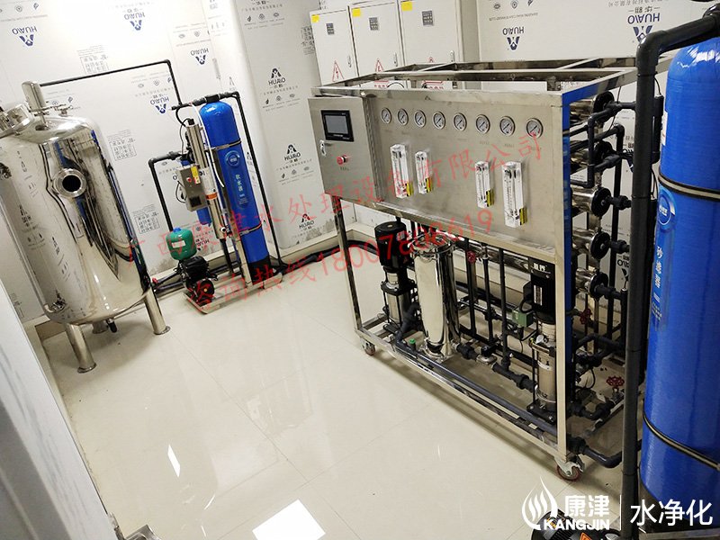 項目名稱:百色百東醫院0.5T雙級反滲透凈水設備 設備名稱:0.5噸雙級反滲透純化水設備 工藝流程:原水-原水泵-石英砂過濾器-活性炭過濾器-反滲透設備-精密過濾器-軟化水設備-凈水箱-變頻供水回水殺菌系統-用水點...