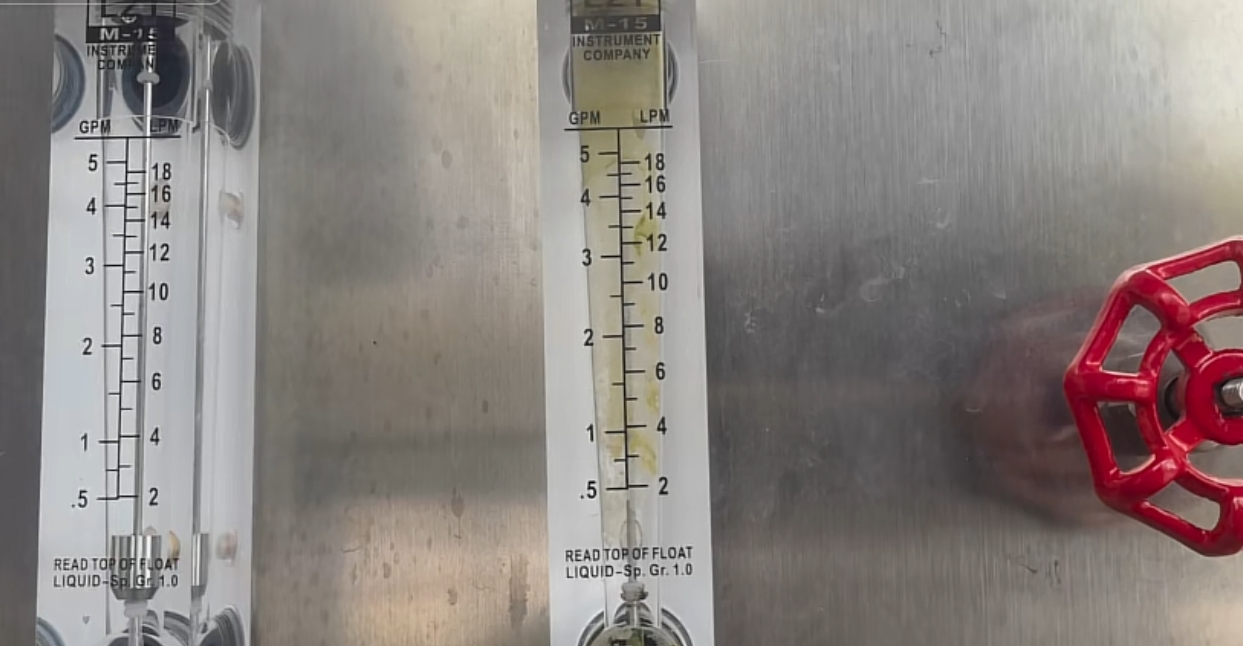 剛到場地后,我們師傅的視線就被流量計給吸引了。通常來說,兩根流量計一個可以看到出水情況一個可以看到進水情況,從外面看,原水流量計已經布滿了黃色水垢,把流量計的軸承拿出,發(fā)現上面已經結滿了水垢。師傅打開右邊的閥門后,觀察到流量計上面的壓力表都顯示壓力,在設備的顯示都正常的情況下,出水管卻只有氣流沒有水流,這說明設備的里面的膜很可能都堵死了。大家也可以對比一下自己的反滲透設備,是不是也是出現了以上的情況,如果是的話也有可能是反滲透膜堵塞的原因。